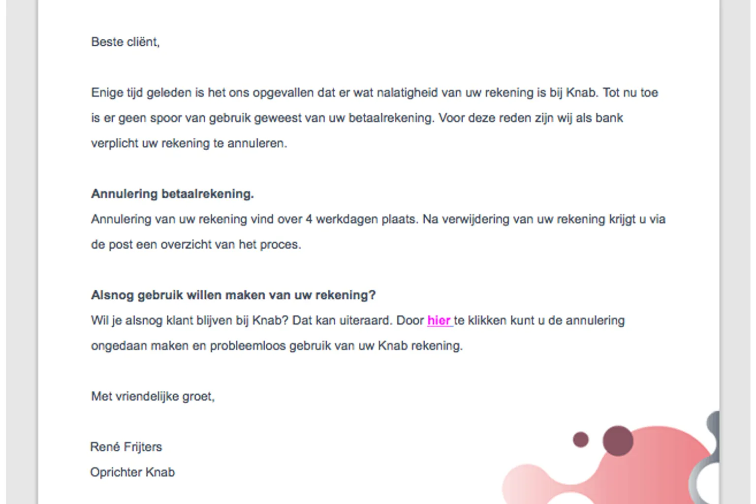 Ontvang je een mail van Knab over een rekening die geannuleerd is? Weg ermee! Deze mail komt niet van de online bank.