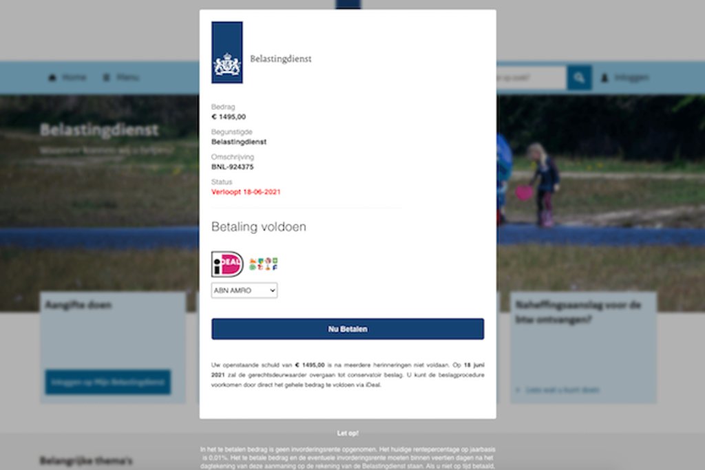 Waar je in de meeste gevallen op een blanco pagina met een betaalpaneeltje belandt, heeft de maker van deze site een geblurde versie van de échte homepage van de Belastingdienst als achtergrond gekozen. Dat is een psychologisch trucje, want hierdoor is het de bedoeling dat je onbewust eerder denkt wel degelijk op de échte Belastingdienst-website te zitten.