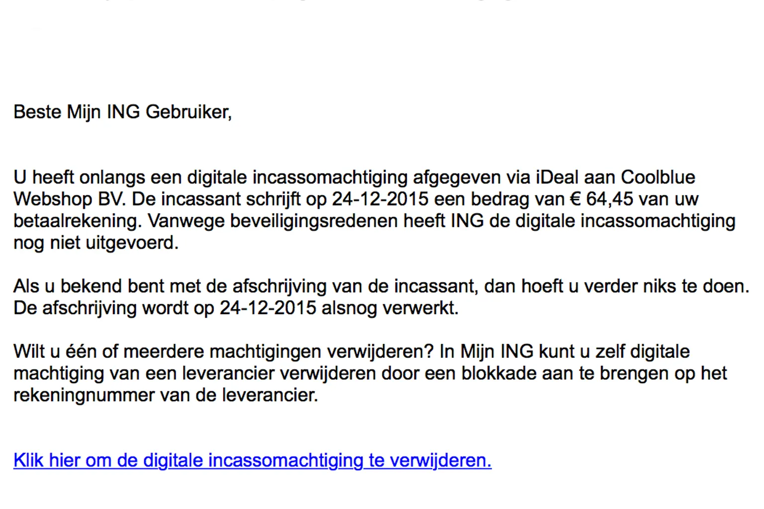 Volgens de mail zou het bedrag via iDeal betaald worden maar heeft ING vanwege beveiligingsredenen de betaling niet uitgevoerd. Het bedrag zal bij een volgende poging alsnog afgeschreven worden. De ontvanger kan ervoor kiezen om te voorkomen dat het bedrag wordt afgeschreven door op een link te klikken.