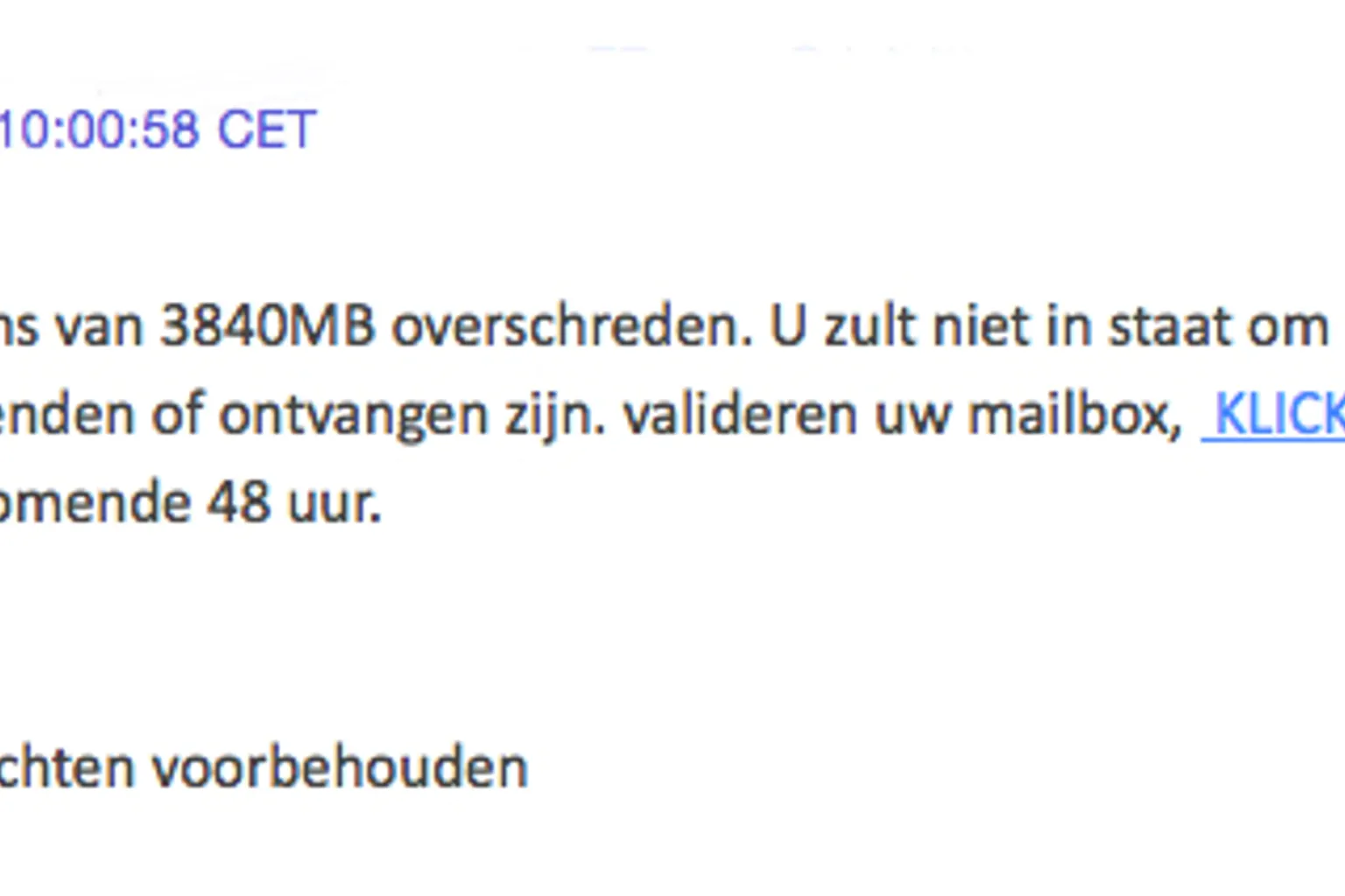Volgens de mail is het onmogelijk de komende 48 uur e-mails te ontvangen of verzenden. In de mail staat, in gebrekkig Nederlands, dat de mailbox gevalideerd moet worden door op een link te klikken.
