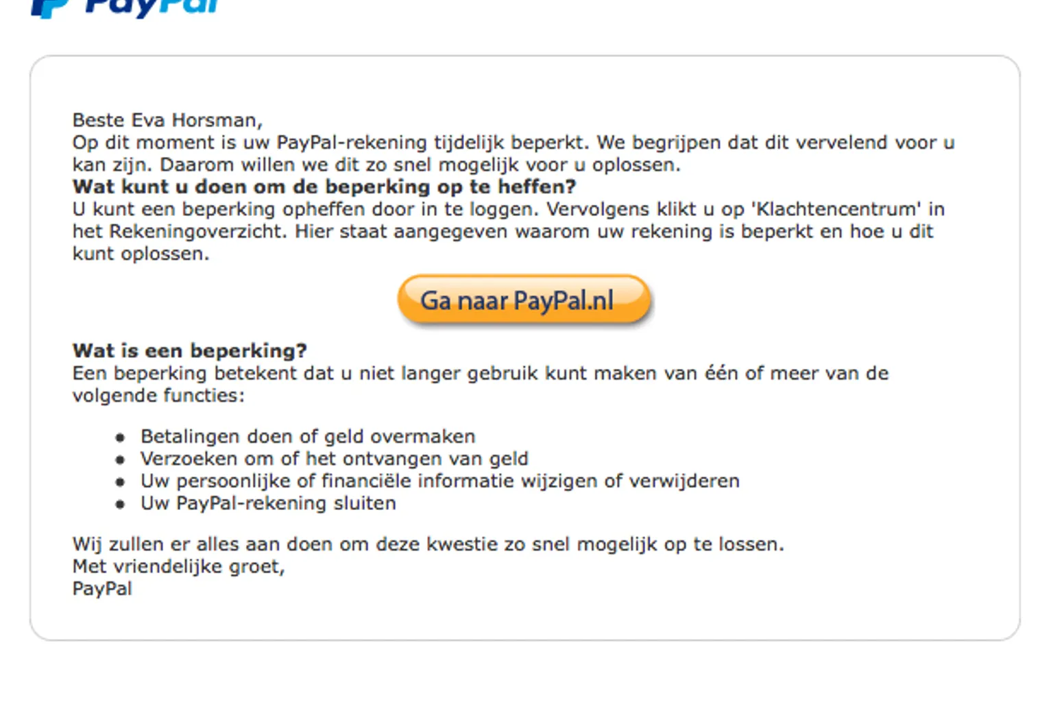 Valse mail PayPal over beperking account