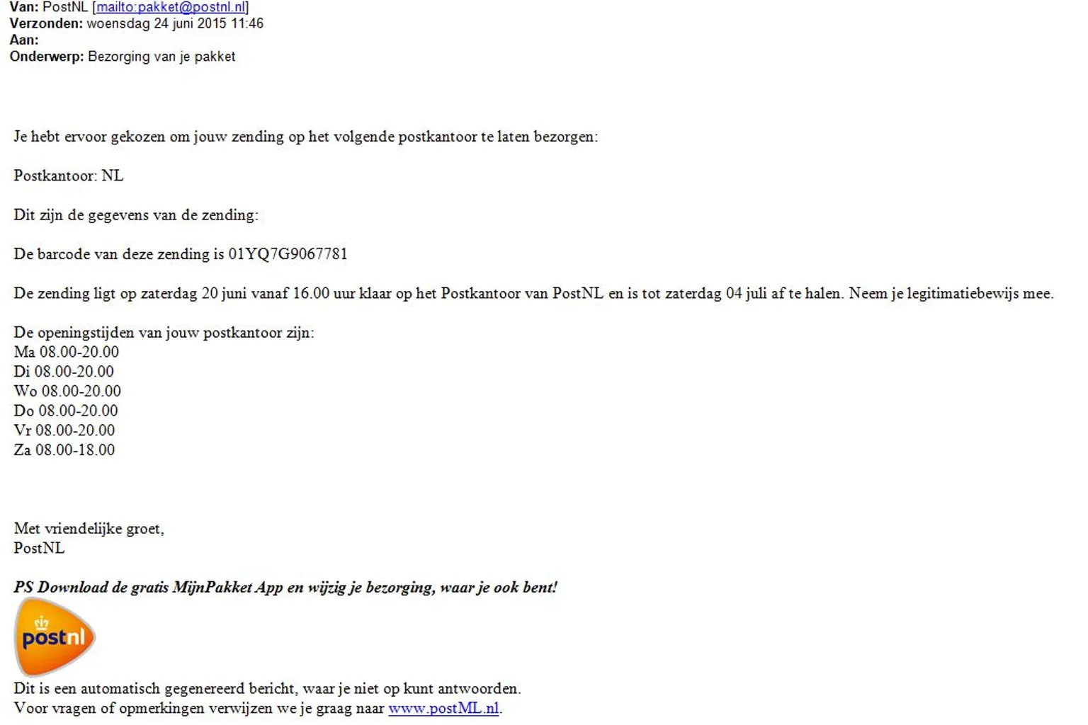 Het gaat hier namelijk om een phishingmail. Het bericht heeft als onderwerp 'Bezorging van je pakket'. De mail is verstuurd op 24 juni, maar het pakket ligt al vanaf zaterdag 20 juni voor u klaar. De oplichters zijn dus nogal slordig geweest. De mail bevat ook een bijlage. Open dit bestand niet! Doe je dit wel dan bestaat de kans dat jouw computer wordt geïnfecteerd met een virus.