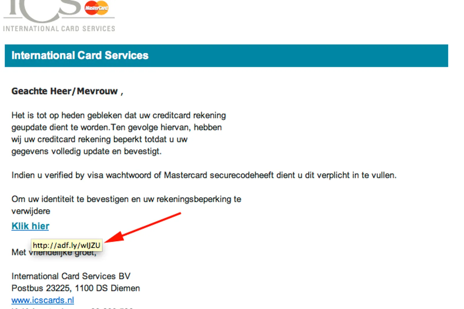 De link in de e-mail verwijst naar een andere website dan die van Visa. Dit kun je zien door met de cursor van de muis op de link te gaan staan, zonder deze aan te klikken. Je ziet dan dat de link niet eindigt op 'Visa.nl'. Visa zou je nooit per mail vragen in te loggen.