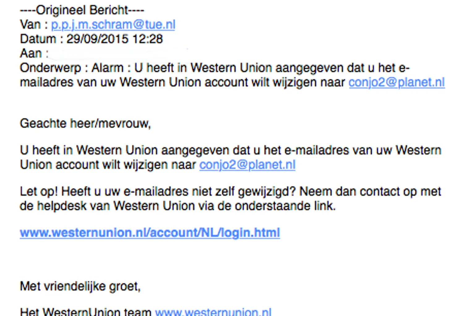Vervolgens wordt gevraagd of de ontvanger van de mail zelf wel het e-mailadres heeft gewijzigd. Mocht dit niet het geval zijn, dan moet er contact opgenomen worden met Western Union via een link.