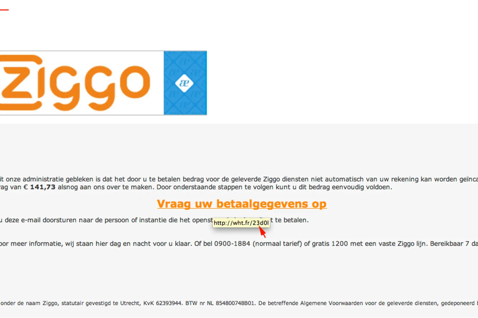 Deze rekening kun je betalen door op de bijgevoegde link te klikken. Wanneer je echter met je muis op de link gaat staan, zie je dat je niet wordt doorgestuurd naar de website van Ziggo, maar naar een heel andere website! In feite betaal je dit bedrag niet aan Ziggo maar aan oplichters. Klik dus niet op de link! Heb je deze mail gekregen, dan kan je deze direct verwijderen.