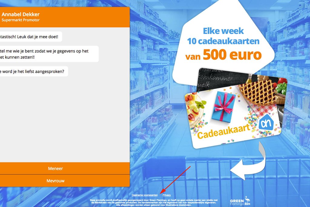 Je kunt je deelname aan de actie bevestigen door op de button in het bericht te klikken. Je wordt dan doorverwezen naar website. Op deze pagina gaat het plotseling niet meer over de actie waar het in de e-mail over ging, maar over een winactie waarbij je cadeaukaarten kunt winnen.