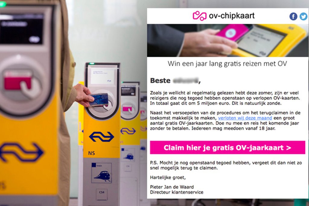 Er is een mail in omloop waarin staat dat je een jaar lang gratis reizen kunt winnen. In het bericht staat dat veel reizigers nog tegoed hebben openstaan op een verlopen kaart. Daarom zou een groot aantal gratis jaarkaarten weggegeven kunnen worden.