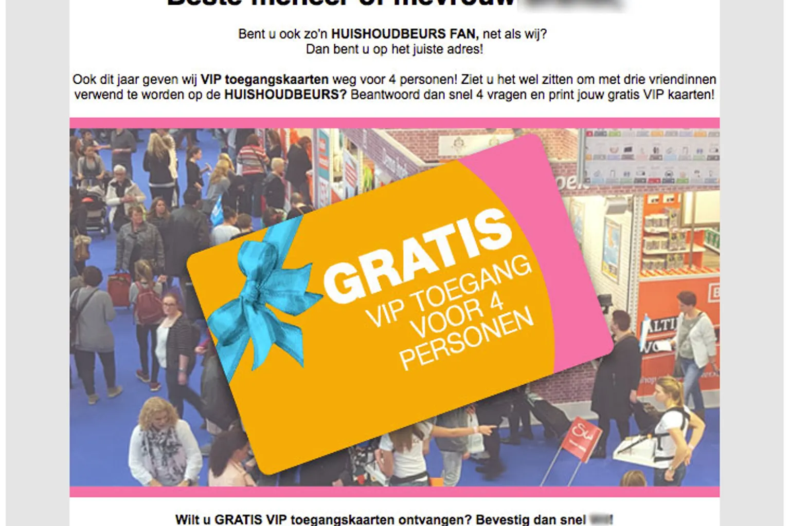 Van 17 tot en met 25 februari vindt de jaarlijkse huishoudbeurs weer plaats. Momenteel is een e-mail in omloop waarin zogenaamd vier gratis VIP-kaarten worden weggegeven. Let op! Dit is een misleidende winactie.