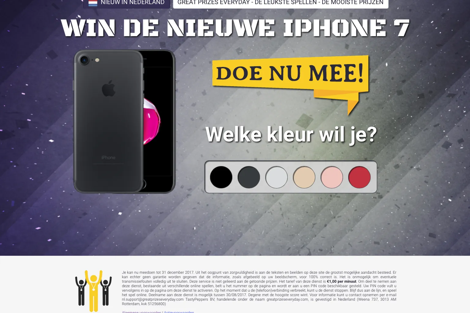 Vergeet niet de kleine lettertjes onderaan de pagina te lezen! Hier wordt duidelijk dat de actie niet is georganiseerd door Apple. Het gaat om een telefonische dienst die €1,00 per minuut kost. Bovendien is het bij dit soort winacties nog maar de vraag of de beloofde prijs daadwerkelijk wordt uitgekeerd. De kans is groot dat je uiteindelijk met lege handen komt te staan, terwijl jouw deelname je veel geld gekost heeft.