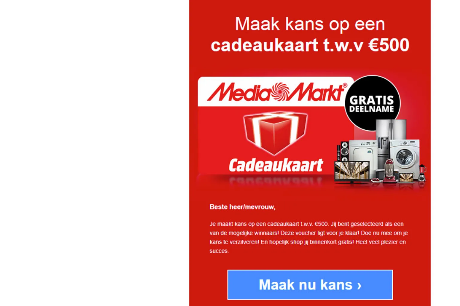 Valse winactie Media Markt: 'Maak kans op een cadeaukaart ter waarde van €500,-!'