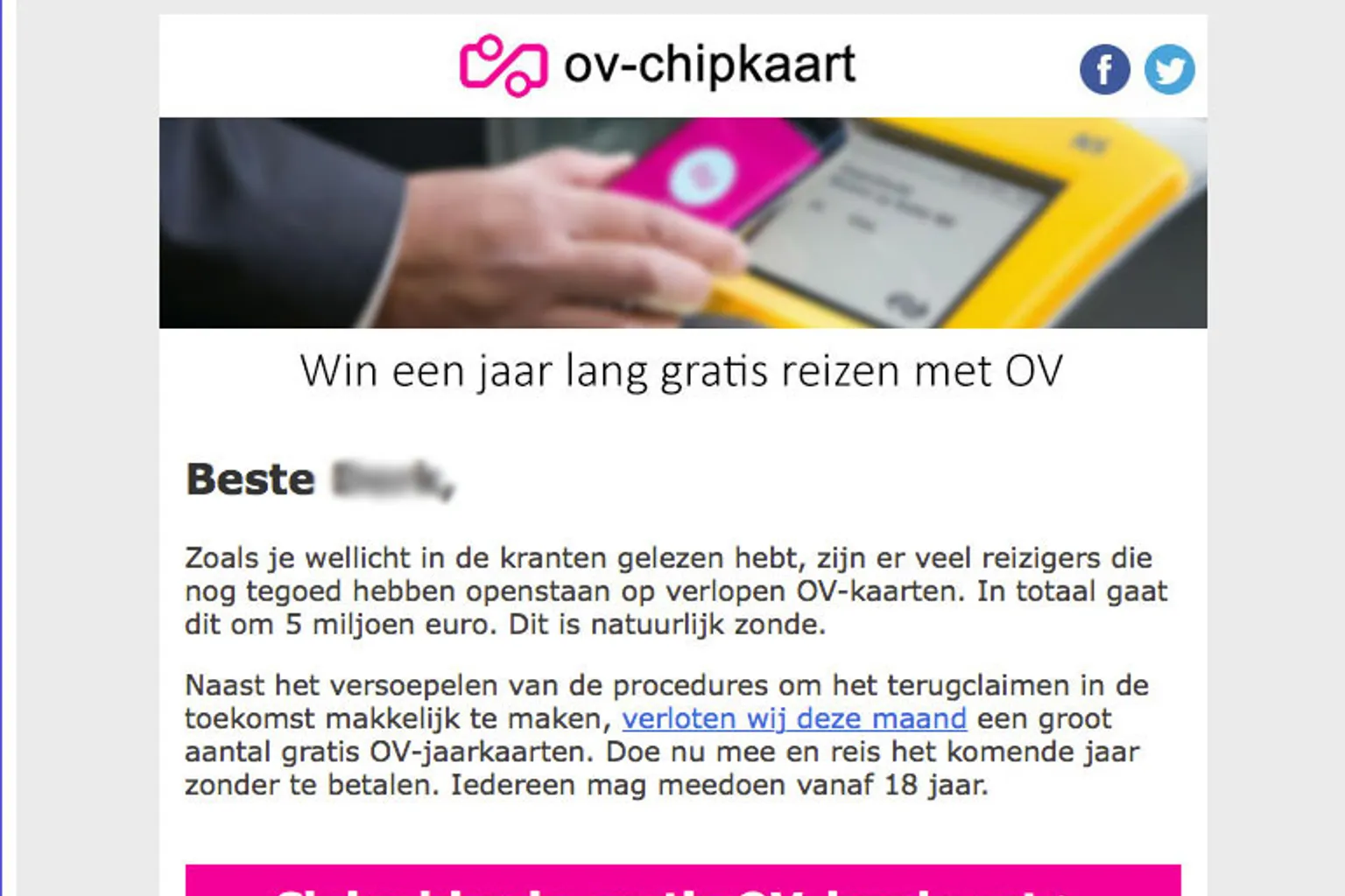 Een e-mail ontvangen waarin staat dat er deze maand een groot aantal gratis ov-jaarkaarten verloot gaat worden? Let op! Ook dit is een valse winactie!
