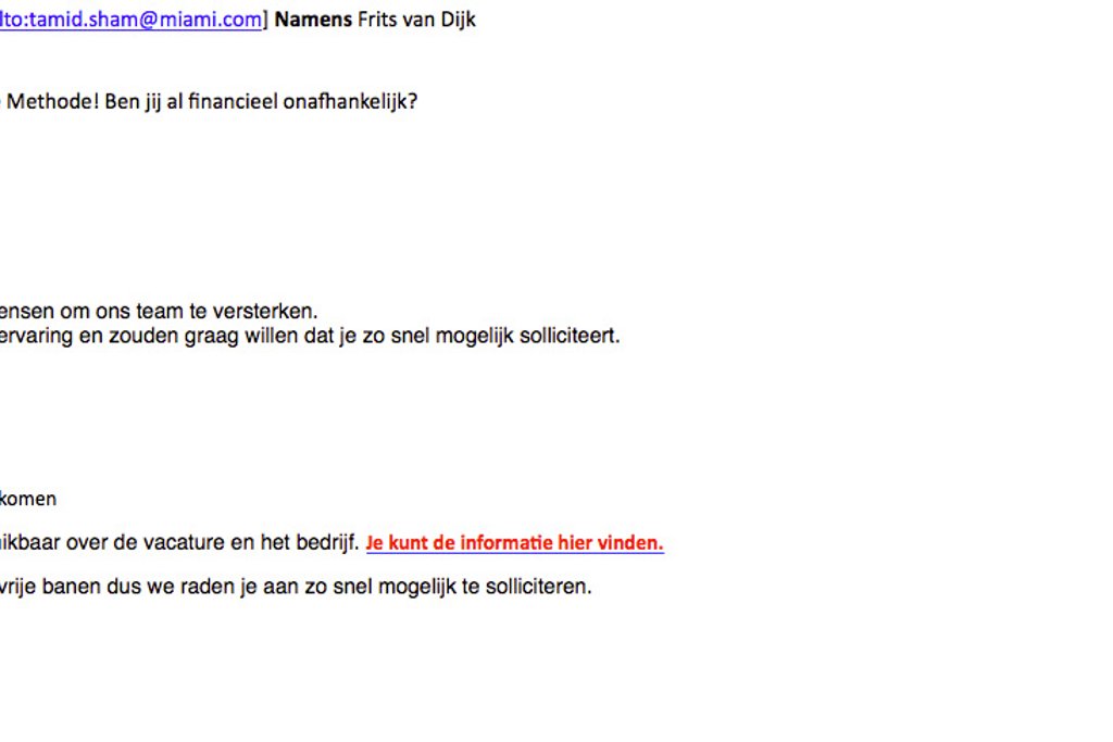 Het zou gaan om een baan van duizenden euro's in de maand. De afzender beweert onder de indruk te zijn van je ervaring en wil dat je komt solliciteren.