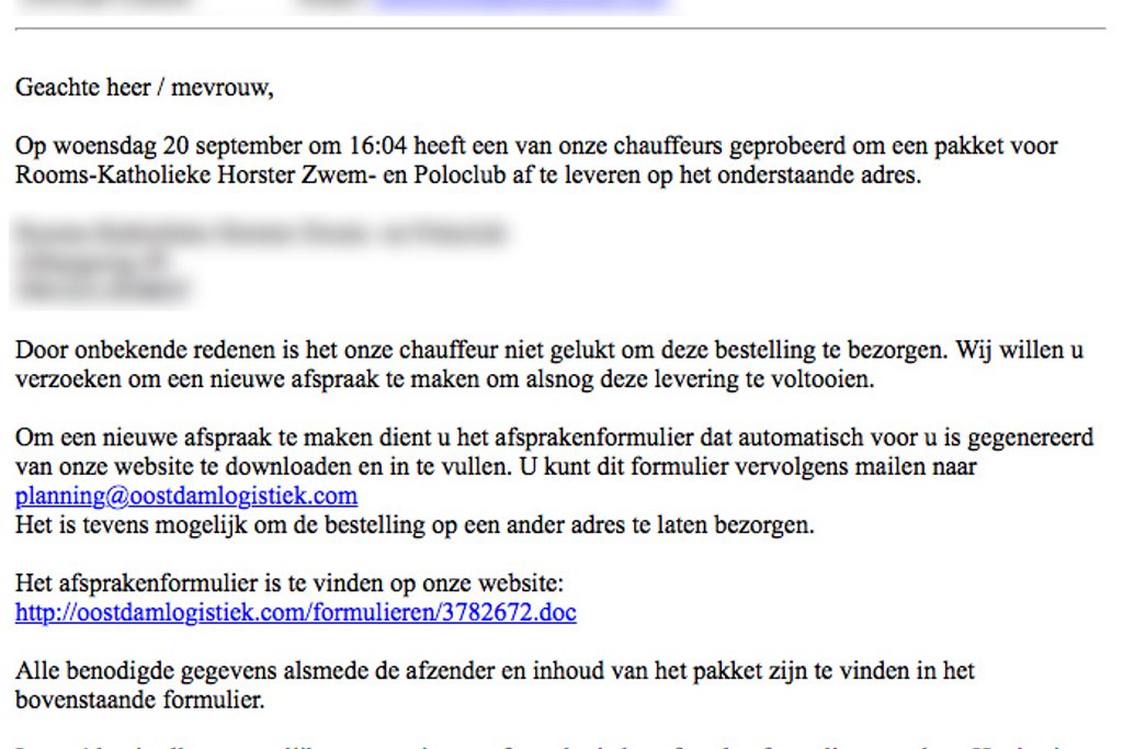 De afzender van de e-mail schrijft dat een chauffeur heeft geprobeerd een pakket af te leveren bij de organisatie van de ontvanger. Om onbekende redenen is dit echter niet gelukt. Om een nieuwe afspraak te maken, dient men een afsprakenformulier te downloaden en in te vullen. Let op! In dit formulier zit malware verstopt. Vermoedelijk gaat het om ransomware.