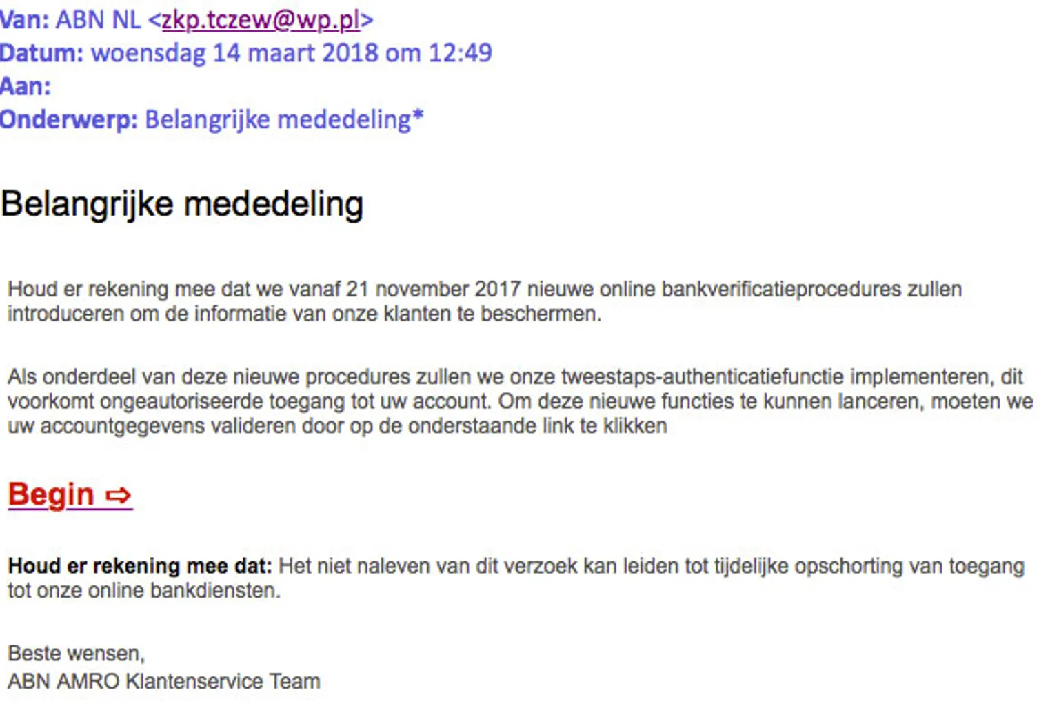 Om de nieuwe methode van inloggen te kunnen gebruiken, dien je je accountgegevens te bevestigen. Als je dit niet doet, zou je tijdelijk geen toegang tot online bankdiensten van ABN AMRO krijgen. Je kunt je gegevens zogenaamd bevestigen door op de link in de e-mail te klikken. Doe dit niet! Criminelen proberen op deze manier aan je gegevens te komen. Als je je gegevens invoert, zullen er frauduleuze praktijken mee kunnen plaatsvinden.