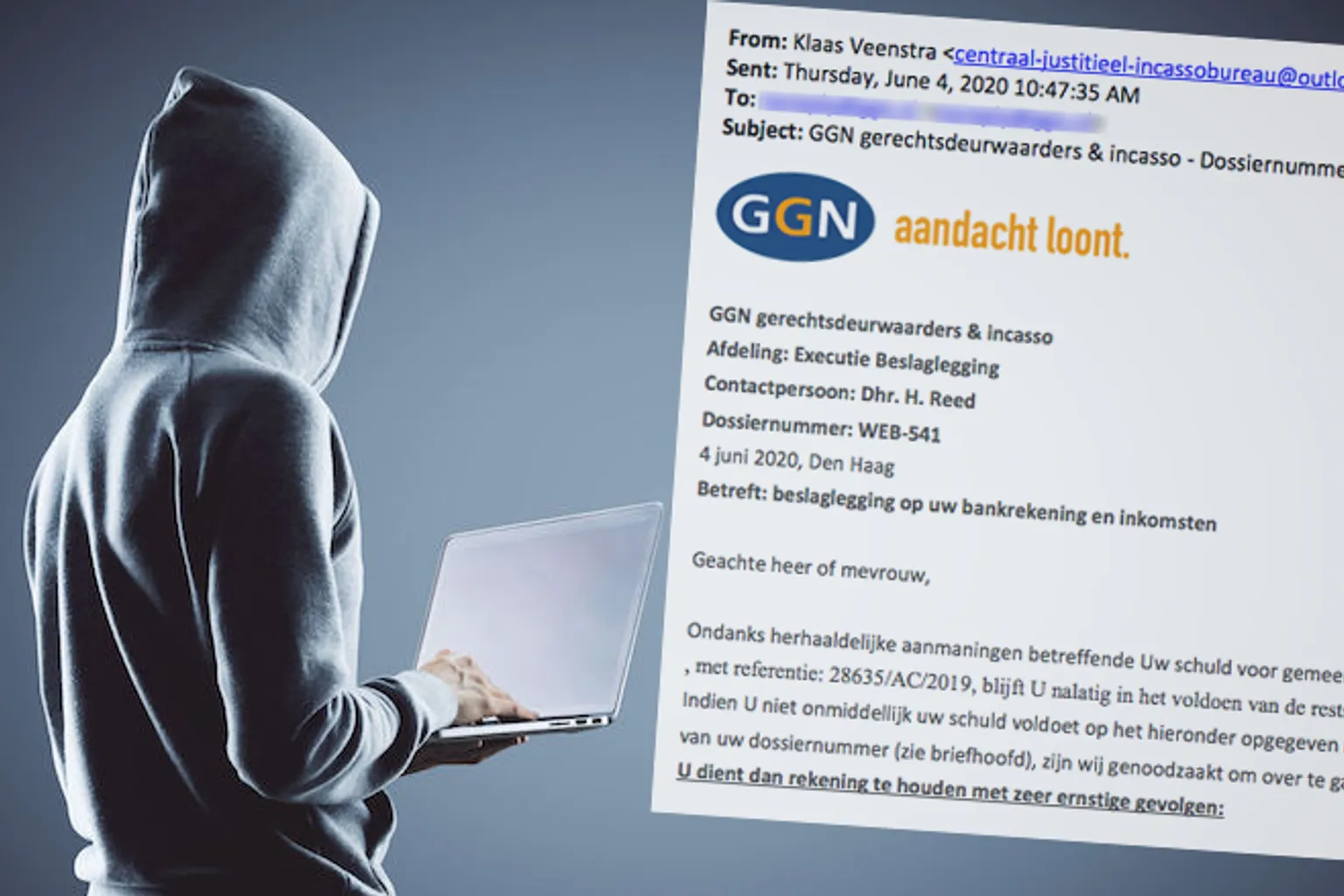 Er gaan spookfacturen rond uit naam van het echt bestaande deurwaardersbureau GGN. Onder kenmerk WEB-541 geeft ene Klaas Veenstra of Klaas Boersma - dat verschilt per mail - je op zeer dreigende wijze te kennen dat er beslag wordt gelegd op je bankrekening. De enige manier om dit te vermijden, is om direct te betalen. Maar dat kun je beter niet doen...