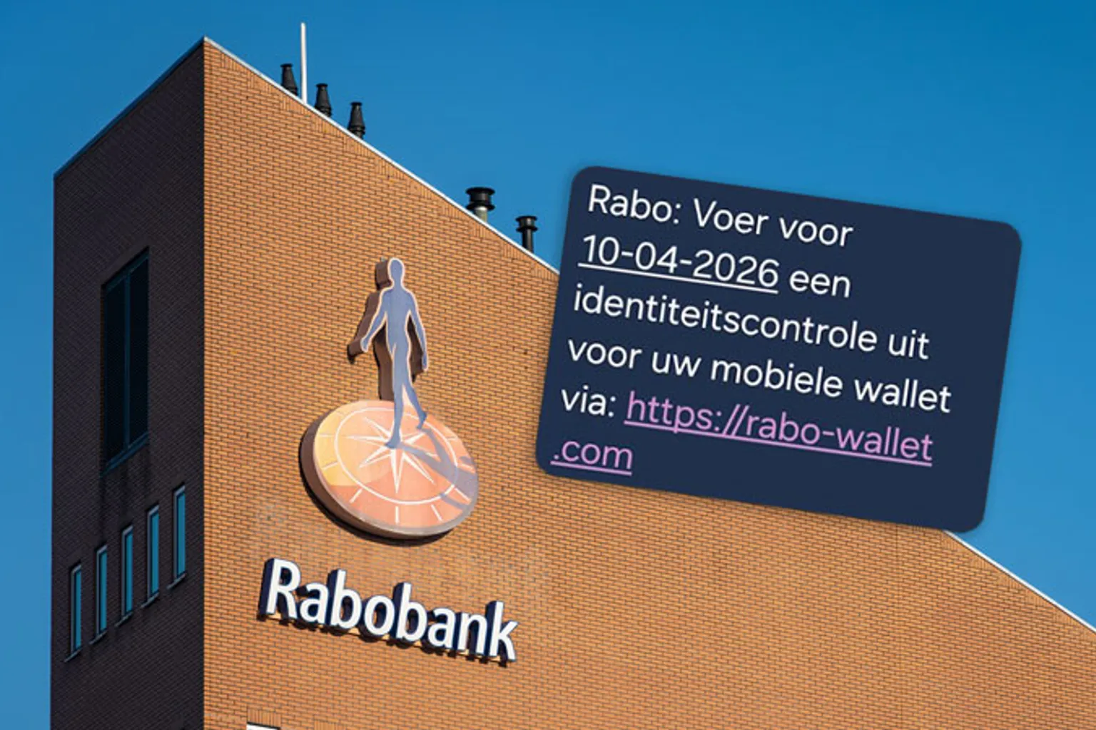 Volgens een frauduleuze Rabobank-sms moet je voor 10 april een identiteitscontrole uitvoeren voor je ‘mobiele wallet’. Trap hier niet in, dit is nep.