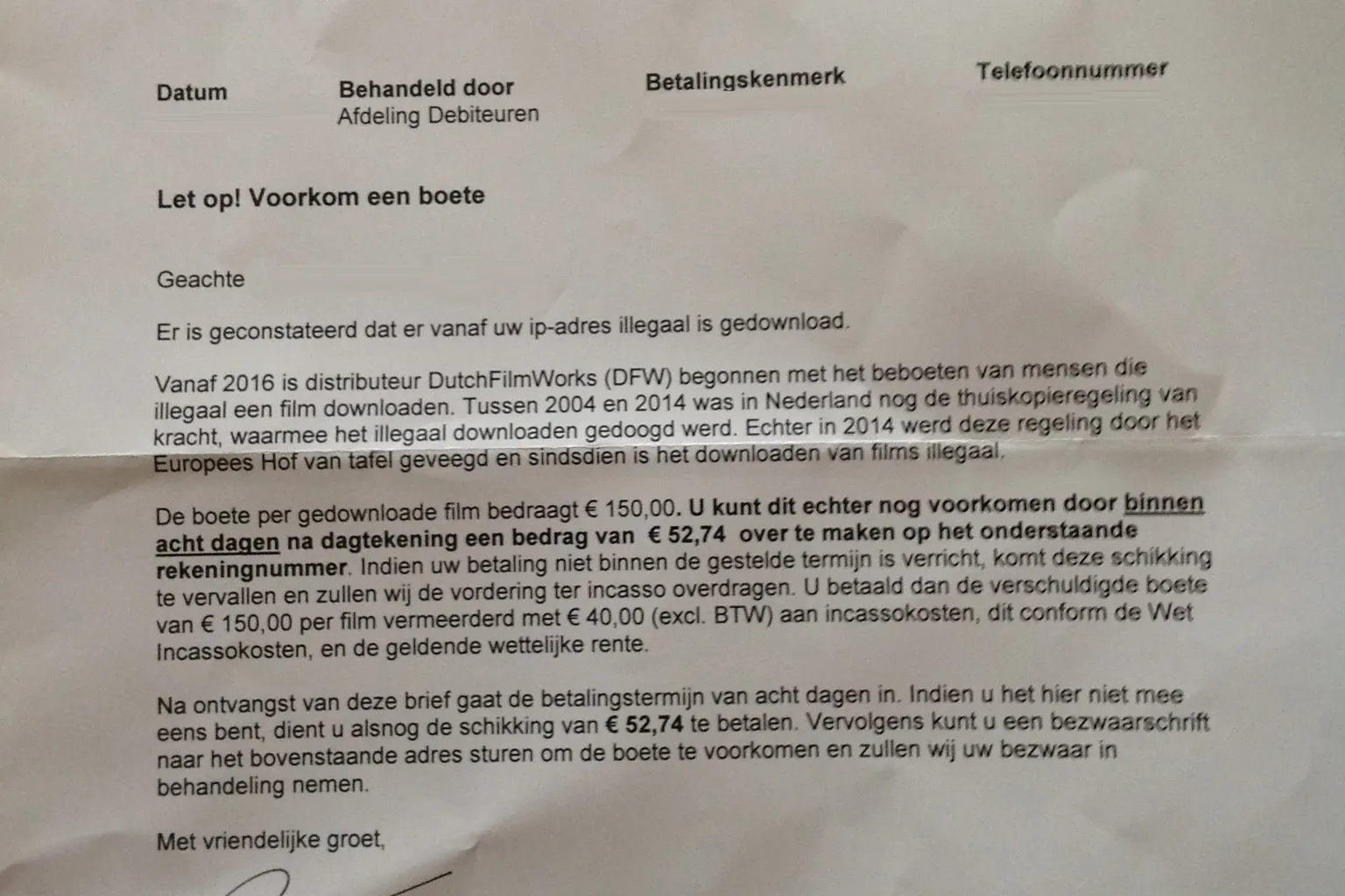 Heb jij ook een brief gekregen van 'Dutch Filmworks' waarin staat dat je een boete moet betalen wegens het illegaal downloaden van een film? Weg ermee! Deze is niet afkomstig van de organisatie, maar van oplichters die je geld afhandig proberen te maken.