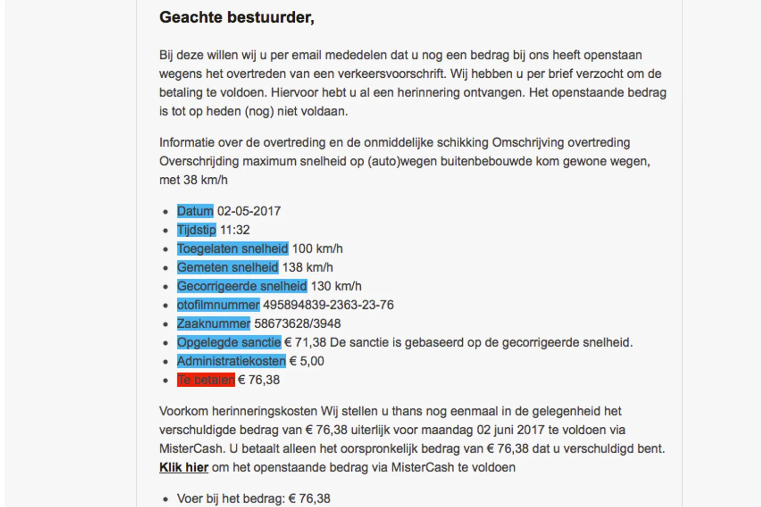 Je hebt zogenaamd een verkeersboete openstaan bij de politie. De e-mail wordt verstuurd omdat je geen gehoor hebt gegeven aan de eerder verstuurde brieven. Je zou de boete voor 2 juni moeten betalen, anders komen er nog extra 'herinneringskosten' bij.