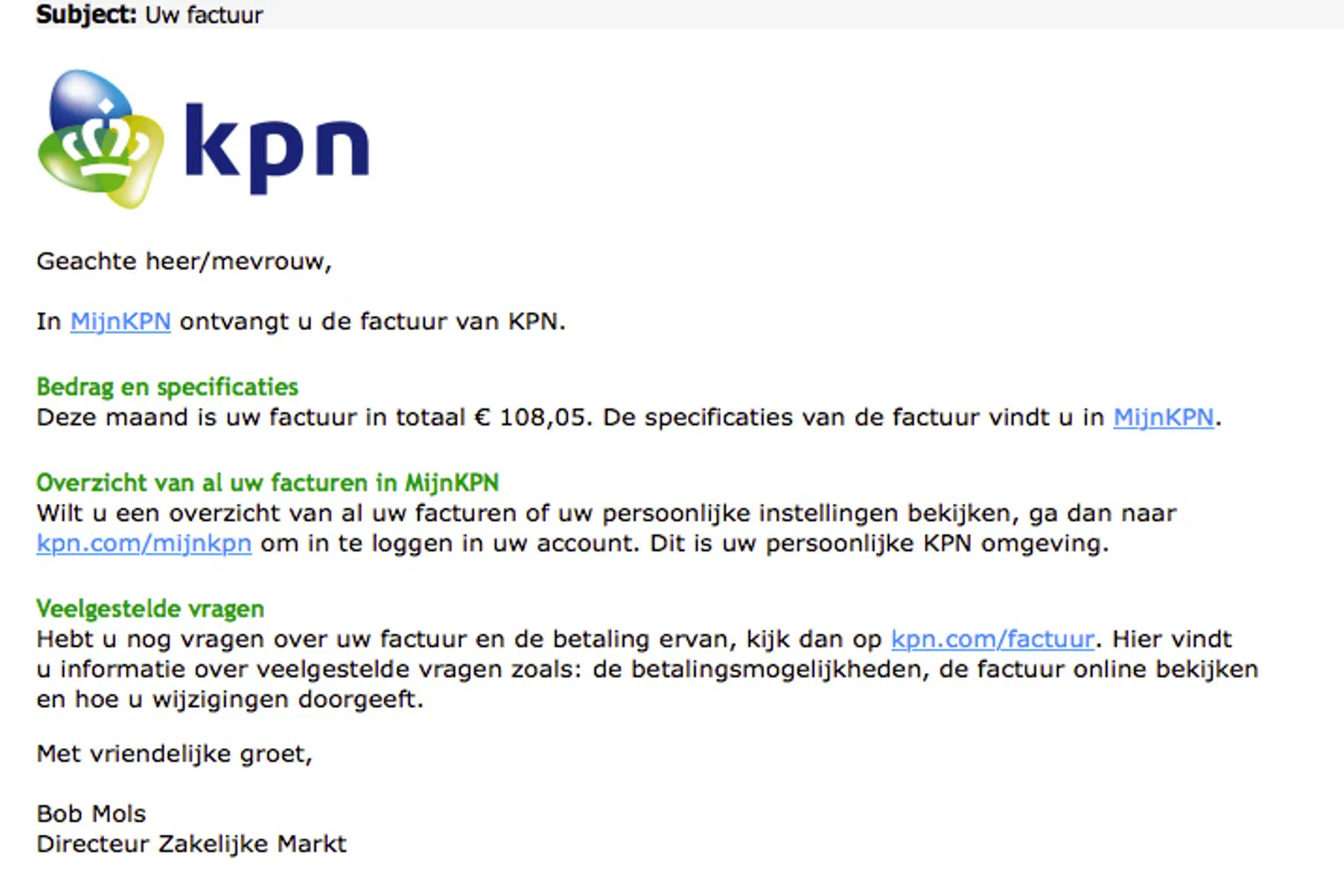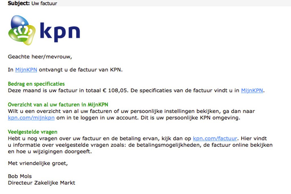 Uit naam van KPN wordt een valse e-mail verstuurd, waarin wordt beweerd dat een factuur voor je klaarstaat. Ga hier niet op in!