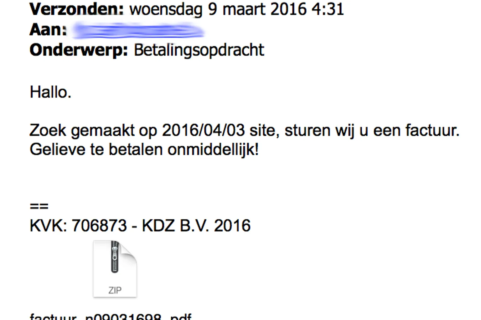Pas op: open de factuur niet! Dit zip-bestand installeert malware op je computer. Verwijder de e-mail! Lees hier meer over malware via e-mail.