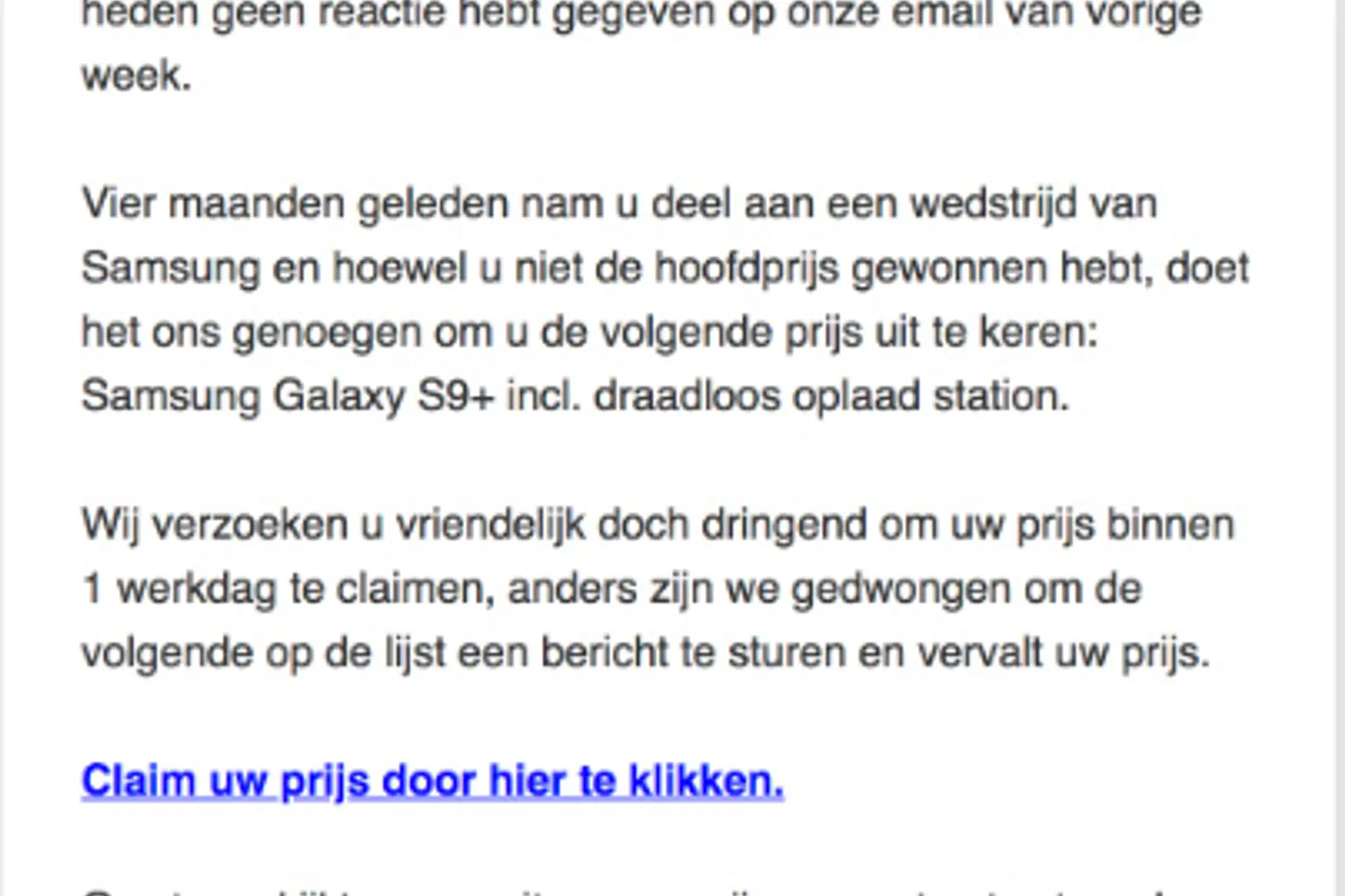 Je hebt een aantal maanden geleden zogenaamd meegedaan aan een wedstrijd van Samsung. Je hebt niet de hoofdprijs gewonnen, maar wel een gloednieuwe smartphone. Je moet je prijs binnen één dag claimen, anders krijgt iemand anders de telefoon. Je prijs kan je claimen via de link in het bericht. Doe dit niet!