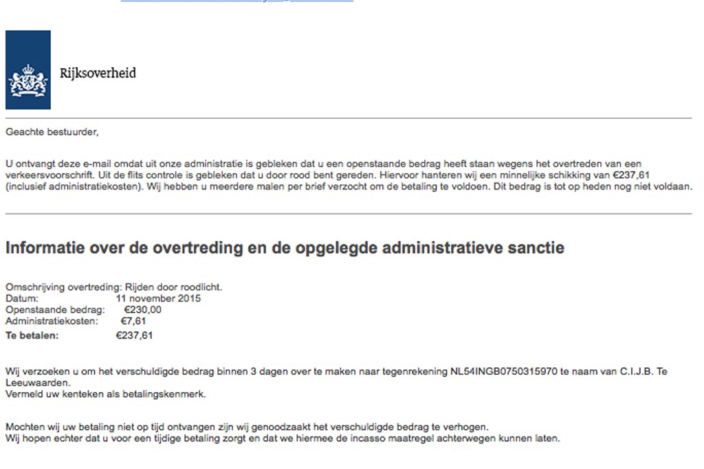 Dit keer gaat het om een bedrag van 237,61 euro, dat je moet overmaken wegens het overtreden van een verkeersvoorschrift. Het geld moet naar rekeningnummer 'NL54INGB0750315970 te naam van C.I.J.B. Te Leeuwaarden.' Ga hier niet op in!