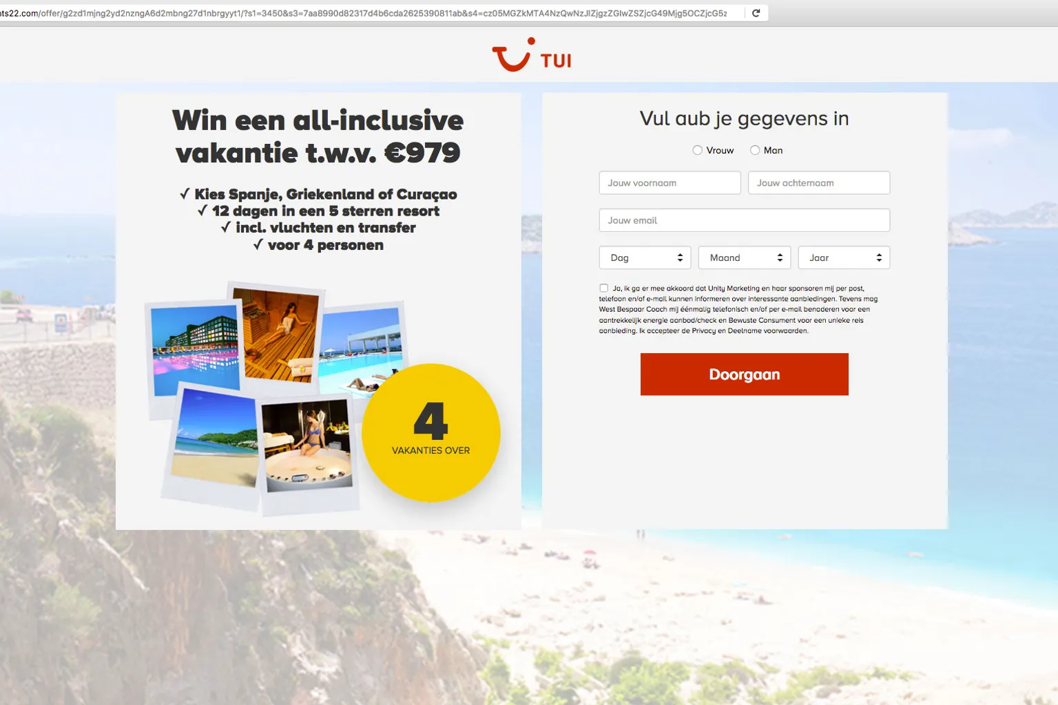 Je zou kunnen kiezen tussen een vakantie in Spanje, Griekenland of op Curaçao. Door te klikken op een van de mogelijke opties, kom je op een website terecht die in stijl van TUI is opgemaakt.