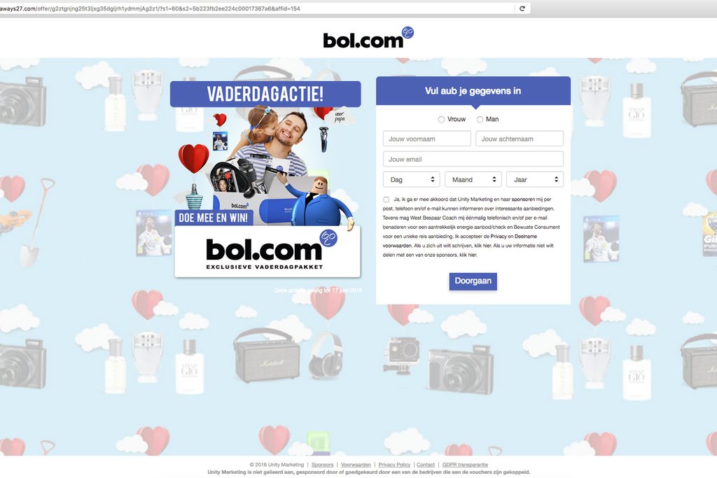 De button verwijst naar een website waar je -zoals verwacht- vragen over Vaderdag gesteld worden. Vervolgens dien je je gegevens in te vullen. We raden je ten zeerste af dit te doen. Als je de algemene voorwaarden leest wordt duidelijk dat bol.com niets met de actie te maken heeft. Je kunt geen vaderdagpakket winnen. Daarnaast staat er geschreven dat de actie is georganiseerd door een marketingbureau dat jouw gegevens wil doorverkopen aan sponsoren. Deze sponsoren zullen je lastigvallen met spamberichten en ongewenste telefoontjes.
