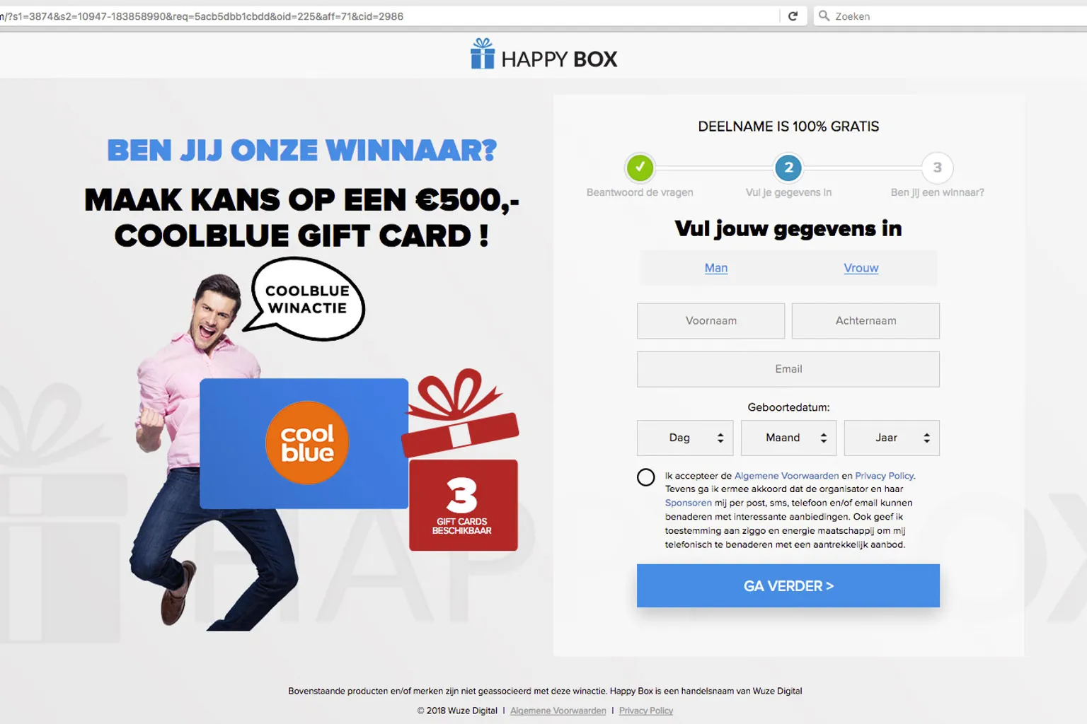 Op de website worden je allerlei vragen gesteld waarna je je gegevens in dient te vullen. We adviseren je ten zeerste om dit niet te doen. In de algemene voorwaarden kun je namelijk lezen dat deze 'winactie' door Happy Box georganiseerd is. Dit is een bedrijf dat jouw gegevens door wil verkopen aan hun sponsoren. Deze sponsoren willen je op hun beurt lastigvallen met spamberichten en ongewenste telefoontjes.