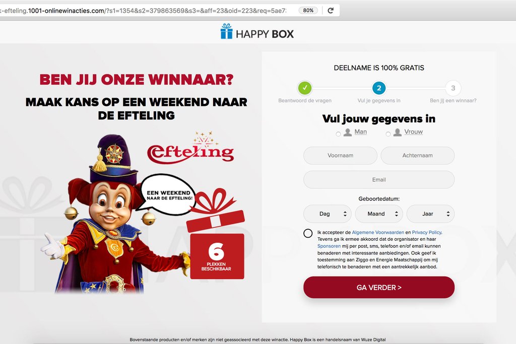 Vervolgens staat er een formulier open waar je gegevens in dient te vullen. Je krijgt mogelijk het gevoel dat je dit snel moet doen. Er wordt op de website immers duidelijk gemaakt dat er steeds minder plekken beschikbaar zijn voor personen die de prijs kunnen winnen. Vul je gegevens hier niet in. Onderaan de pagina wordt namelijk duidelijk dat je geen weekendje Efteling kunt winnen. Daarnaast blijkt uit de algemene voorwaarden dat deze winactie door een marketingbureau is georganiseerd. Dit bureau wil jouw gegevens doorverkopen aan sponsoren van de actie. Dit zal leiden tot ongewenste telefoontjes en veel spamberichten.