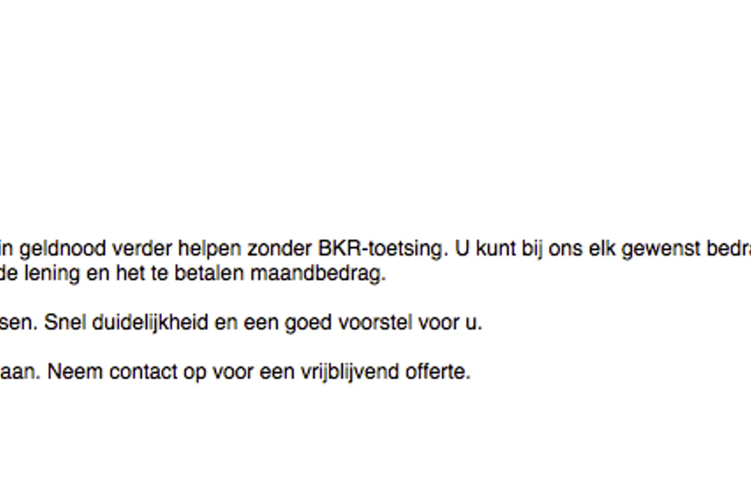 Mocht je een e-mail krijgen waarin je een lening wordt aangeboden, ga hier niet op in! Criminelen kunnen zeer overtuigend en aanhoudend zijn. Voor het afsluiten van een lening kun je het beste een afspraak maken bij je bank. Wil je meer informatie over dit onderwerp? In dit artikel staat hoe je kunt nagaan of een kredietverstrekker betrouwbaar is.