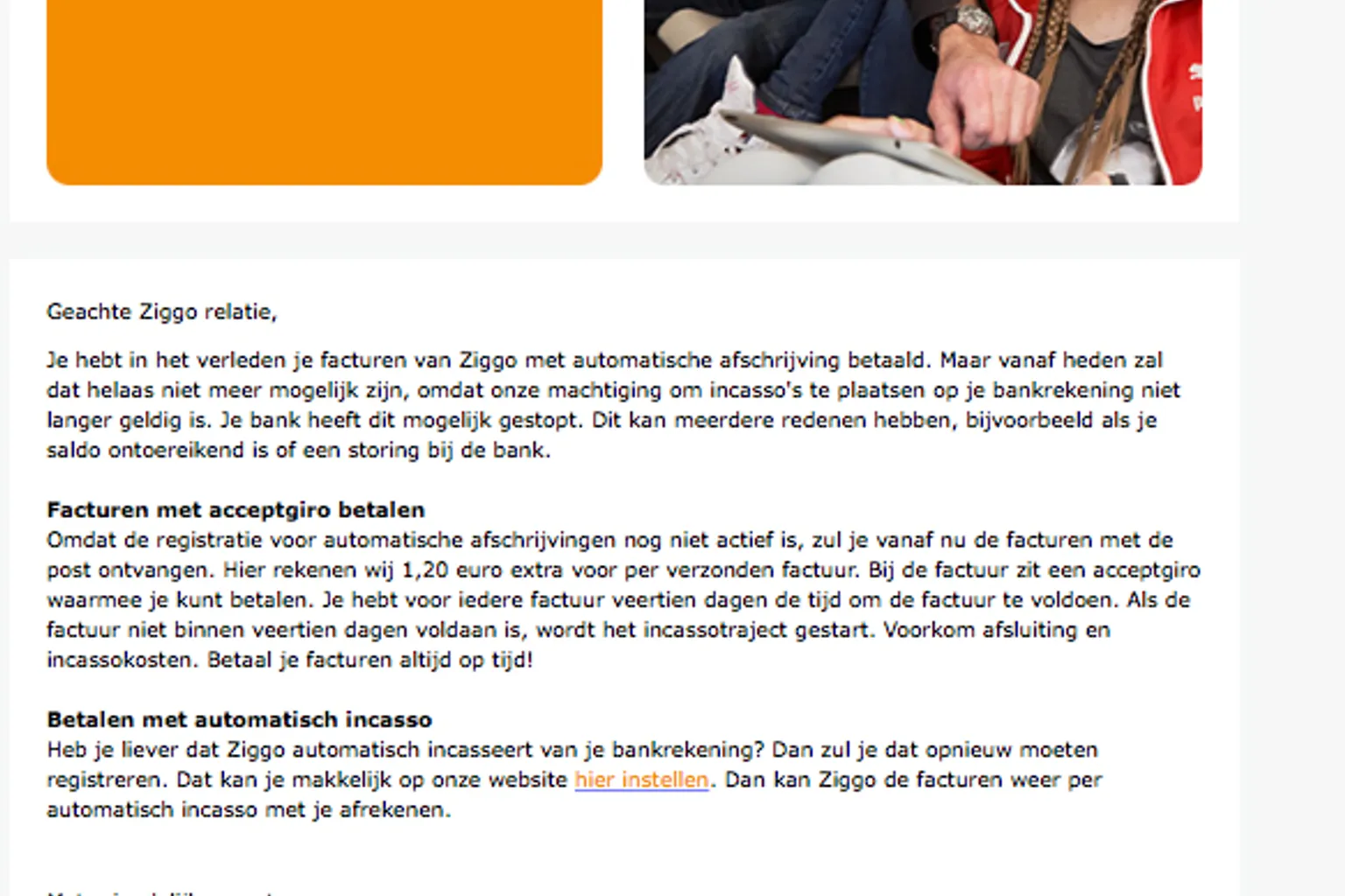 Ze sturen een valse e-mail rond waarin staat dat je vanaf nu je facturen per post zal ontvangen. Wil je toch liever betalen via automatische incasso? Dan hoef je enkel even op de link te klikken en daar je gegevens in te vullen. Maar let op! De link stuurt je naar een nepsite, nagebouwd in de stijl van Ziggo.
