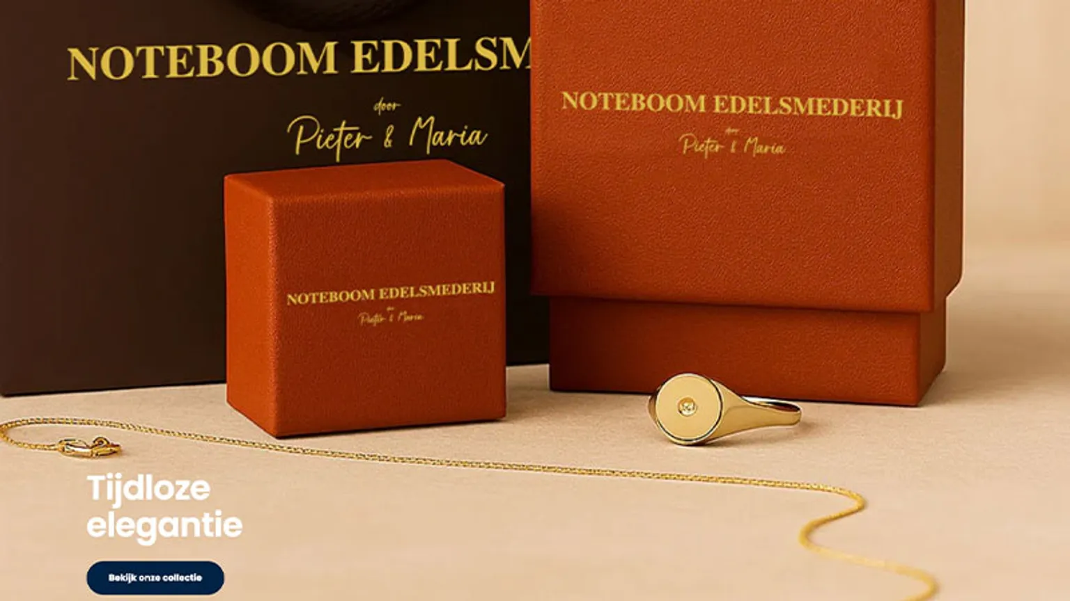Op de 'over ons'-pagina staat: "Al meer dan 33 jaar hebben mijn man Pieter en ik met hart en ziel gebouwd aan ons levenswerk: Noteboom Edelsmederij." Het dankwoord is aangevuld met een foto die gemaakt lijkt te zijn met AI, gezien de té perfect gepolijste foto. Ook staat onder het bedrijfslogo 'door Pieter & Maria'. Laat je niet meeslepen door deze teksten, want dit is gebakken lucht. Cybercriminelen hopen zo empathie en vertrouwen bij je op te wekken.