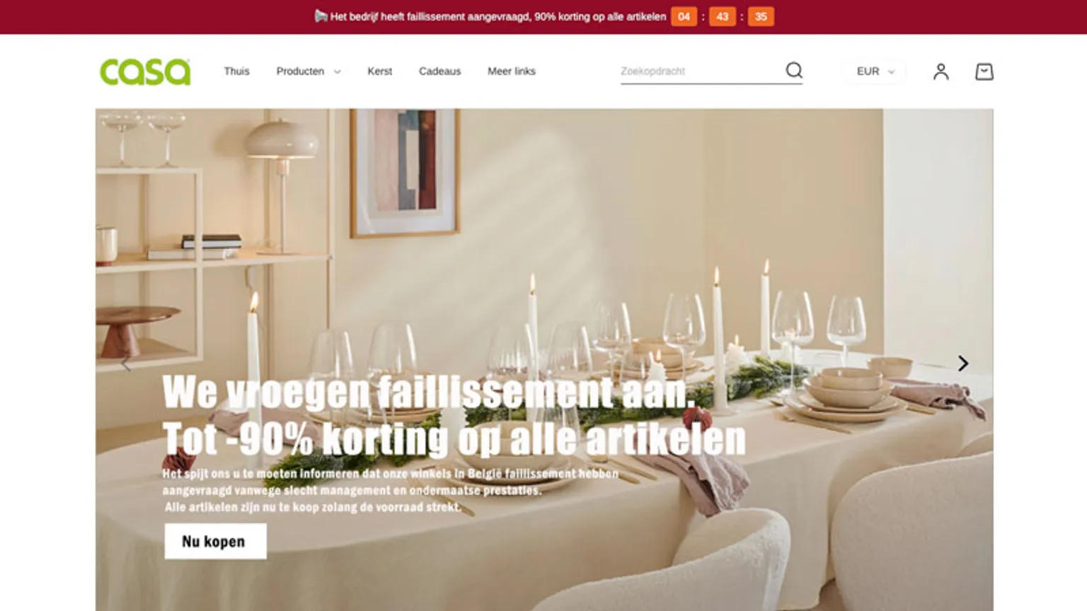 Woonwinkel Casa vroeg in België al een tijd geleden faillissement aan en ook met de Franse tak gaat het bergafwaarts. Malafide webshop 'shopcasashopvip.shop' speelt hier slim op. Op de homepagina staat in koeienletters "We vroegen faillissement aan. Tot -90% korting op alle artikelen." Door het Belgische faillissement zou er een grote uitverkoop zijn zolang de voorraad strekt.