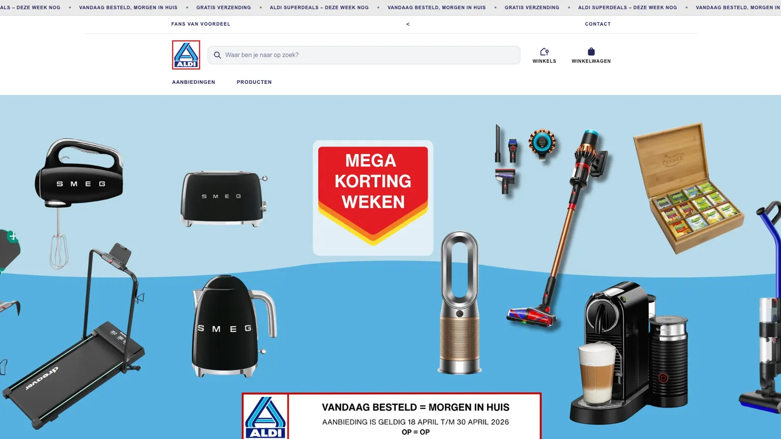 Van de Dyson V15 Detect stofzuiger en Dyson Airwrap tot een De’Longhi Nespresso-apparaat of SMEG broodrooster en handmixer: ‘aldi-deal.com’ stunt met een supersale in april. Je scoort de producten zogenaamd voor bedragen tussen de 50 en 190 euro en je kunt volgens de website ‘veilig’ betalen met iDEAL | Wero. De webshop belooft gratis verzending met PostNL en bezorging de volgende dag. Je kunt er geen boodschappen bestellen.