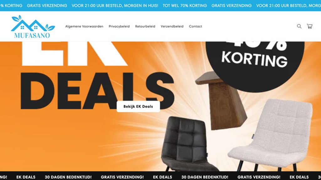 De malafide webwinkel 'mufasano.nl' verkoopt zowel heren- en dameskleding als meubels. Trap niet in de zogenaamde 'EK Deals', want je krijgt de producten niet geleverd.