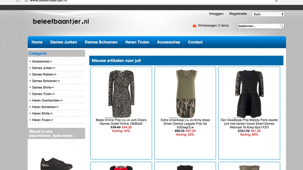 De bovengenoemde websites hebben allemaal dezelfde opmaak. Op de sites zijn geen bedrijfsgegevens terug te vinden. Contact is enkel mogelijk via een contactformulier. Ook ontbreekt informatie over Privacy en Verzenden/Retouren.