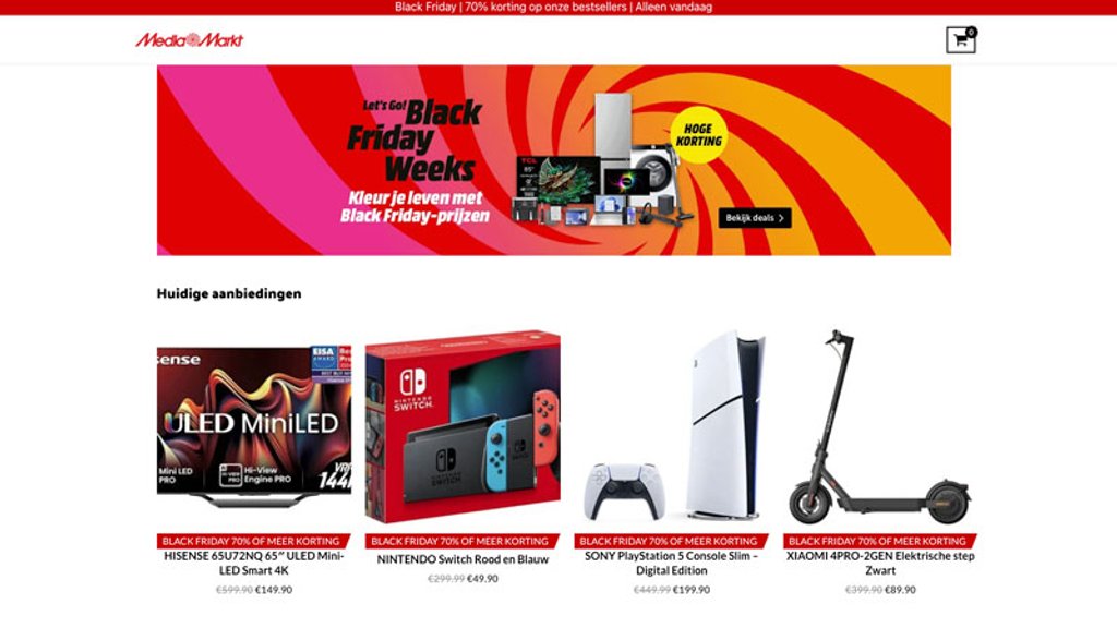 Webshop 'nl-mediamarkt.com' gebruikt precies dezelfde Black Friday afbeelding op zijn website als de legitieme webwinkel van Media Markt, 'mediamarkt.nl'. Op de namaak website wordt bovendien gestrooid met kortingen van zeventig procent op bestsellers. Alleen vandaag kun je zogenaamd een Nintendo Switch van tweehonderd euro voor vijftig euro kopen of een Sony Playstation 5 console van vierhonderd euro voor tweehonderd euro. Laat je niet verleiden, want de politie ontving meerdere meldingen over deze nepwebshop.