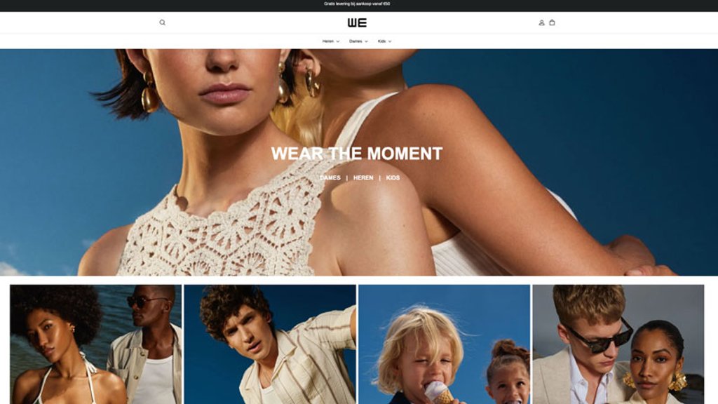 Op het eerste gezicht lijkt dit een betrouwbare WE-webshop. De modellenfoto's zijn scherp, de technische functies werken naar behoren en de officiële WE-slogan 'WEAR THE MOMENT' staat in grote letters op de website. Het lijkt dus alsof je je op de echte website van het Nederlandse modemerk begeeft.
