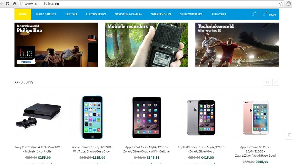 Conradsale.com is een nep-webshop die misbruik maakt van de naam en het logo van een bestaande winkel - in dit geval Conrad. De vermelde prijzen zijn te mooi om waar te zijn, dus trap er niet in. De officiële site van Conrad is www.conrad.nl.