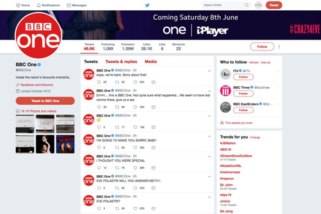 Ook werden via BBC One tweets gedeeld als 'leuk kapsel heb je, het ziet eruit alsof iemand een snor op een toffee heeft geplakt' en 'het enige dat jou interessant maakt ben ik.' De BBC twitterde op een bepaald moment dat ze de controle kwijt waren en vroegen om wat tijd om weer op orde te komen.