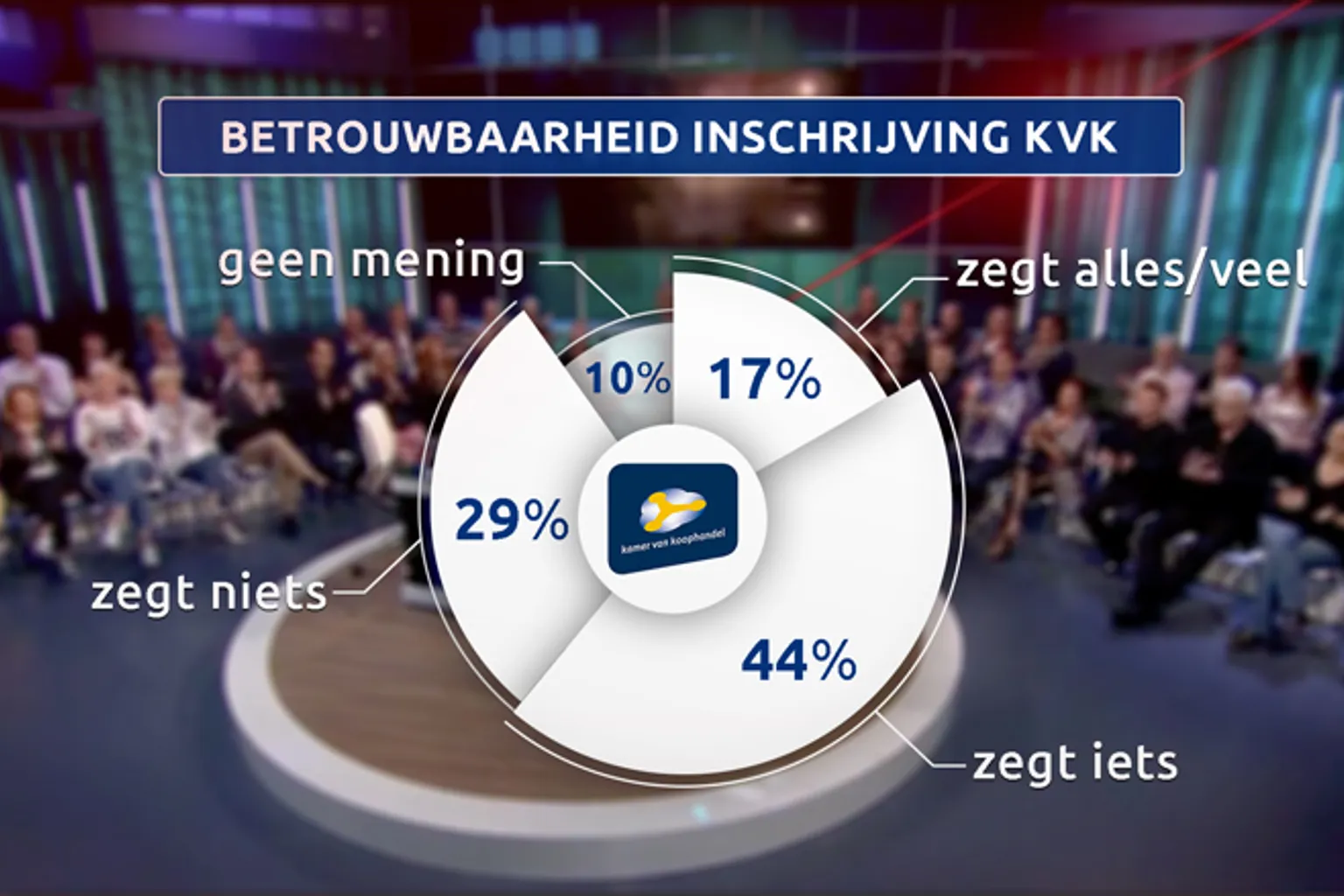 Een meerderheid van bijna 25.000 respondenten gelooft dat een inschrijving bij de Kamer van Koophandel (KvK) iets zegt over de betrouwbaarheid van een ondernemer of bedrijf. Toch zeggen 878 mensen uit deze groep in de afgelopen 3 jaar gedupeerd te zijn door een bedrijf dat zij vooraf in dit register hadden gecheckt. De KvK controleert namelijk niet alle gegevens die een bedrijf opgeeft. 95 procent zou graag zien dat de KvK meer informatie geeft, of de opgegeven informatie wél controleert.