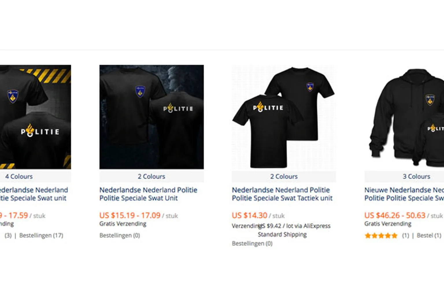 Op de bekende online webshop AliExpress is bijvoorbeeld een shirt met een Nederlands politielogo te bestellen voor nog geen drie euro. De verzending van het product is zelfs gratis en de koper kan uit verschillende kleuren kiezen. Volgens de politie mag het niet. 'Het verkopen van deze kleding is strafbaar', zegt een woordvoerder. 'Het politielogo is gewoon geregistreerd en mag niet worden gebruikt op nagemaakte kleding.'