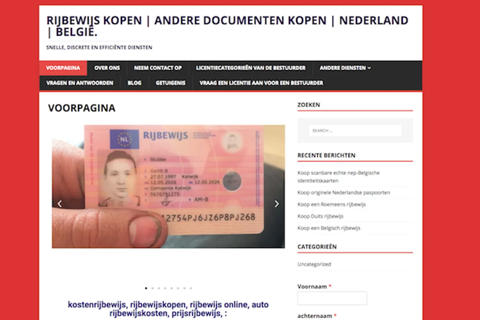 De website kopenrijbewijs.com biedt allerlei soorten officiële documenten te koop aan. Rijbewijzen, identiteitskaarten, paspoorten en verblijfsvergunningen, het kan allemaal niet op. Er is echter wel een probleem: je bent niet alleen strafbaar als je vervalste documenten koopt, maar vermoedelijk krijg je na het doen van een forse betaling helemaal niets geleverd.
